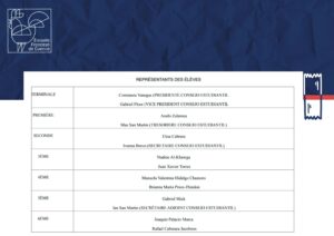 Este espacio directivo se organizó mediante un proceso democrático con el cual dos alumnos de cada curso fueron electos en sus aulas después de haber desarrollado campañas participativas y de propuestas. Entre los representantes electos se designó a la directiva general que se compone por la presidenta, el vicepresidente, tesorera y dos secretarios.