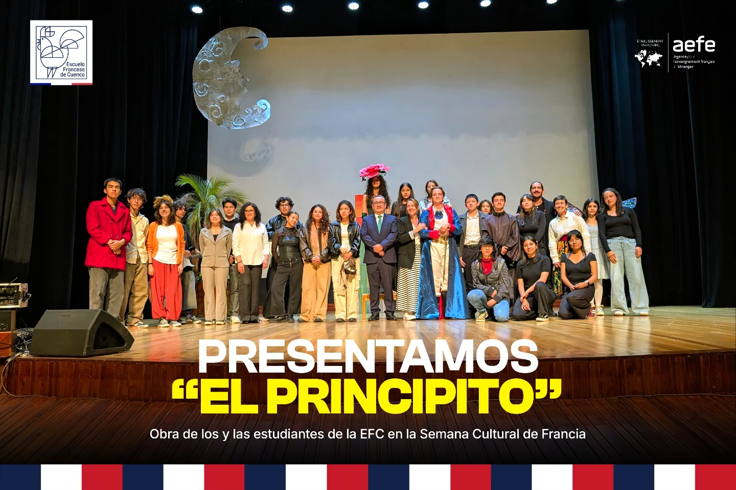 En el Teatro Sucre de Cuenca, nuestras y nuestros estudiantes de la Escuela Francesa de Cuenca presentaron una hermosa interpretación de El Principito, el clásico francés que ha inspirado a generaciones en todo el mundo.